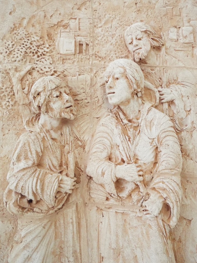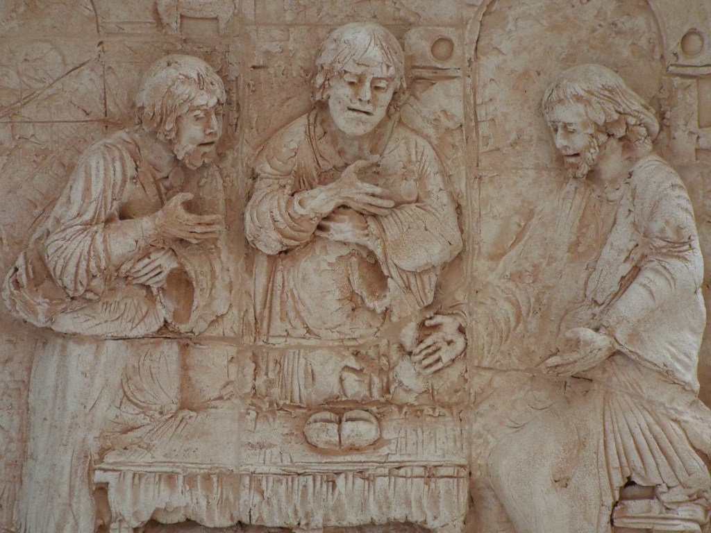Ambone e Mensa riportano due momenti della scena evangelica dell’incontro di Gesù con i discepoli di Emmaus (Lc 24, 13-35), dopo la Risurrezione. Si tratta di altorilievi, opera di Enrico Zacchi e di suo figlio Riccardo: sotto l’ambone i due discepoli discutono tra loro lungo la strada e sono raggiunti da Gesù, che accostandosi e camminando con loro, spiega l’accaduto (la sua crocifissione e morte) mediante le Scritture. Sotto la Mensa, ormai entrati in casa, lo riconoscono al momento della frazione del pane, che fa ardere il loro cuore, già acceso dalla sua Parola: «Non ardeva forse in noi il nostro cuore mentre egli conversava con noi lungo la via, quando ci spiegava le Scritture?» È ciò che ci accade ogni volta che, nella celebrazione eucaristica, ci lasciamo toccare dalla Parola e dall’offerta, annunciata nell’Ultima cena, che Gesù fa del suo corpo, sulla Croce.