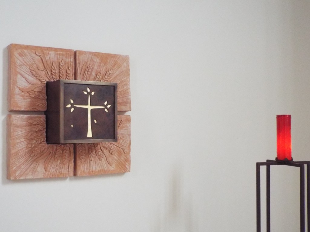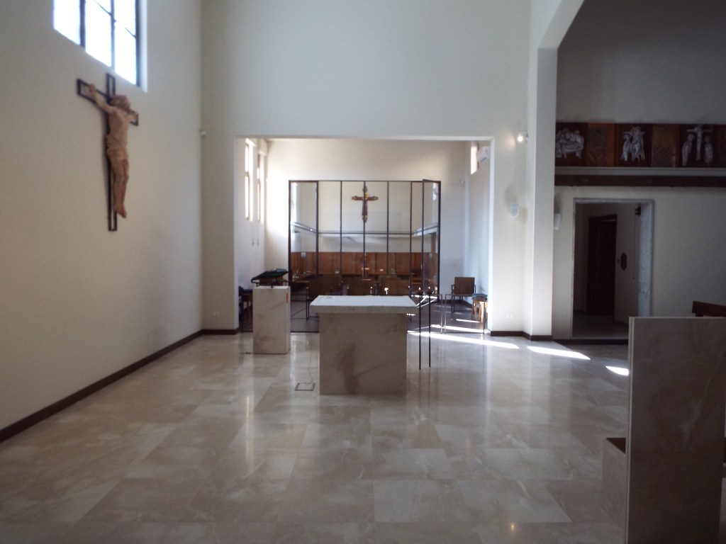 Dopo le decisioni del Santo Padre Francesco (riportate nei documenti pontifici usciti in questi ultimi anni), che permettono ad ogni comunità claustrale di scegliere il tipo di separazione da adottare, abbiamo scelto di renderci un po’ più visibili, quasi un’unica assemblea celebrante con le persone che vengono per l’Eucarestia. Ampliando l’apertura che dà sullo spazio che occupiamo durante la celebrazione, con un semplice cancellino che ci separa dal presbiterio, e sostituendo la vetrata colorata con una più semplice, la chiesa ha guadagnato anche in luminosità.