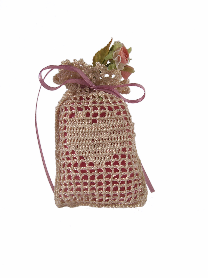 Bomboniera realizzata a mano e composta da un sacchettino all’uncinetto con il disegno centrale di un cuore.