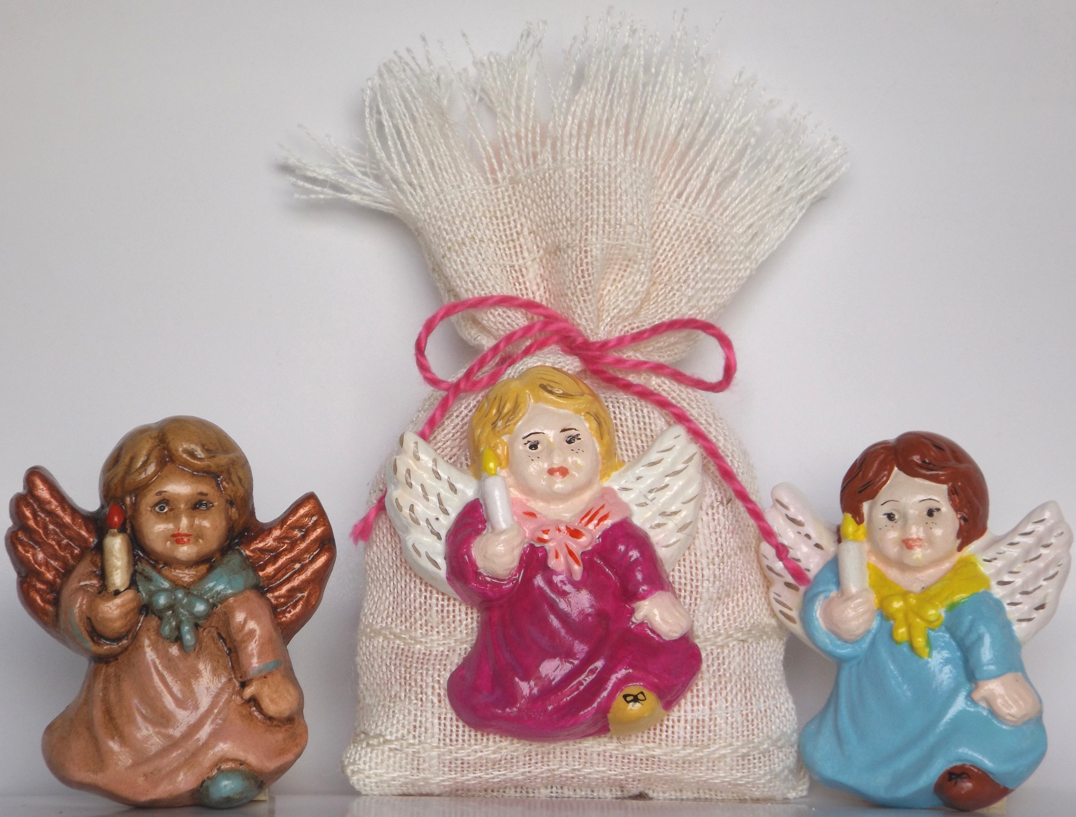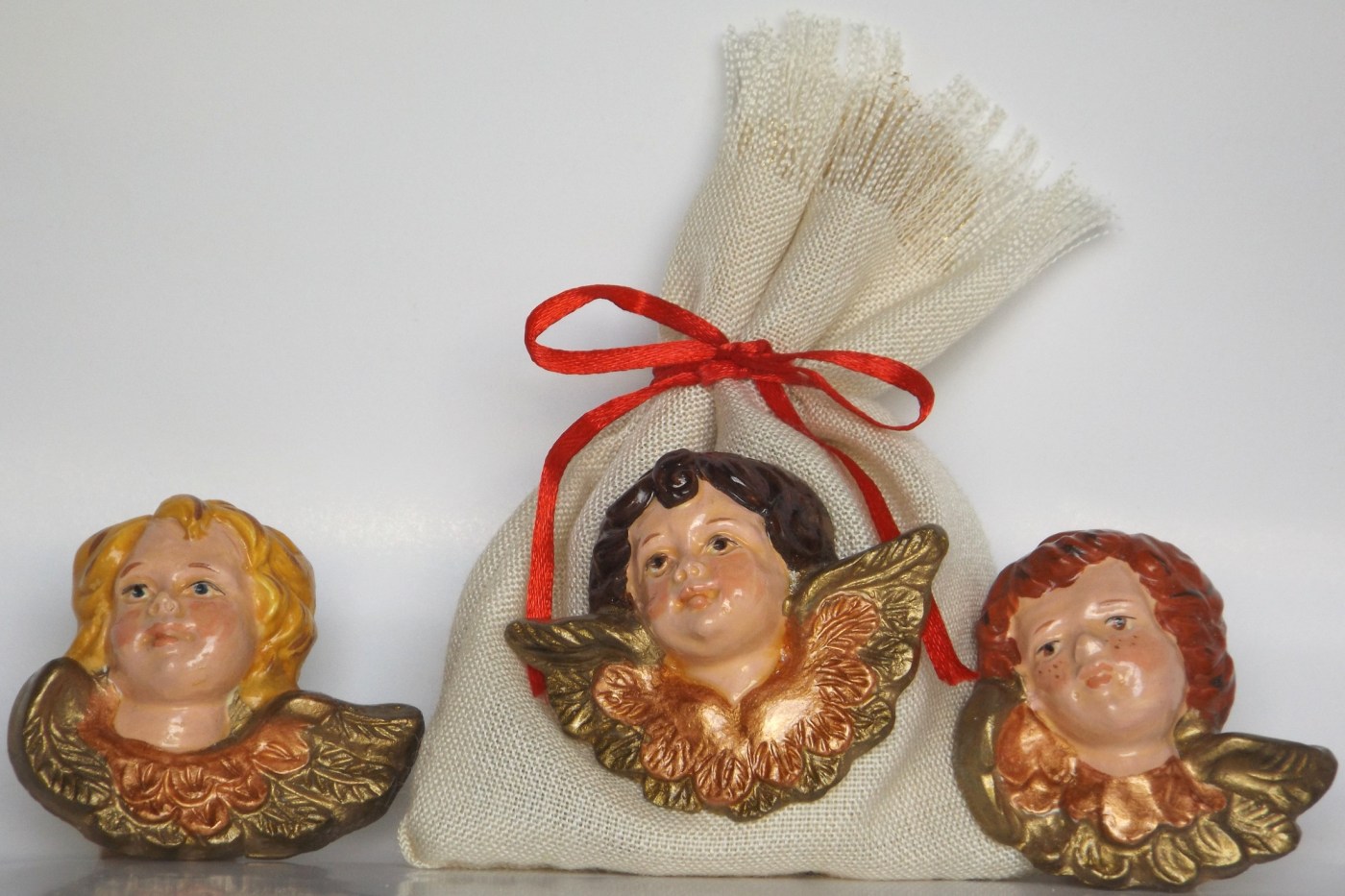 Bomboniera realizzata a mano e composta da un sacchettino di tela con diverse tipologie di angioletti in gesso, arricchita con nastro. Gli angioletti, dipinti a mano, possono essere realizzati su richiesta, incollati o posizionati con una spilla. Applicazione di decorazioni varie.