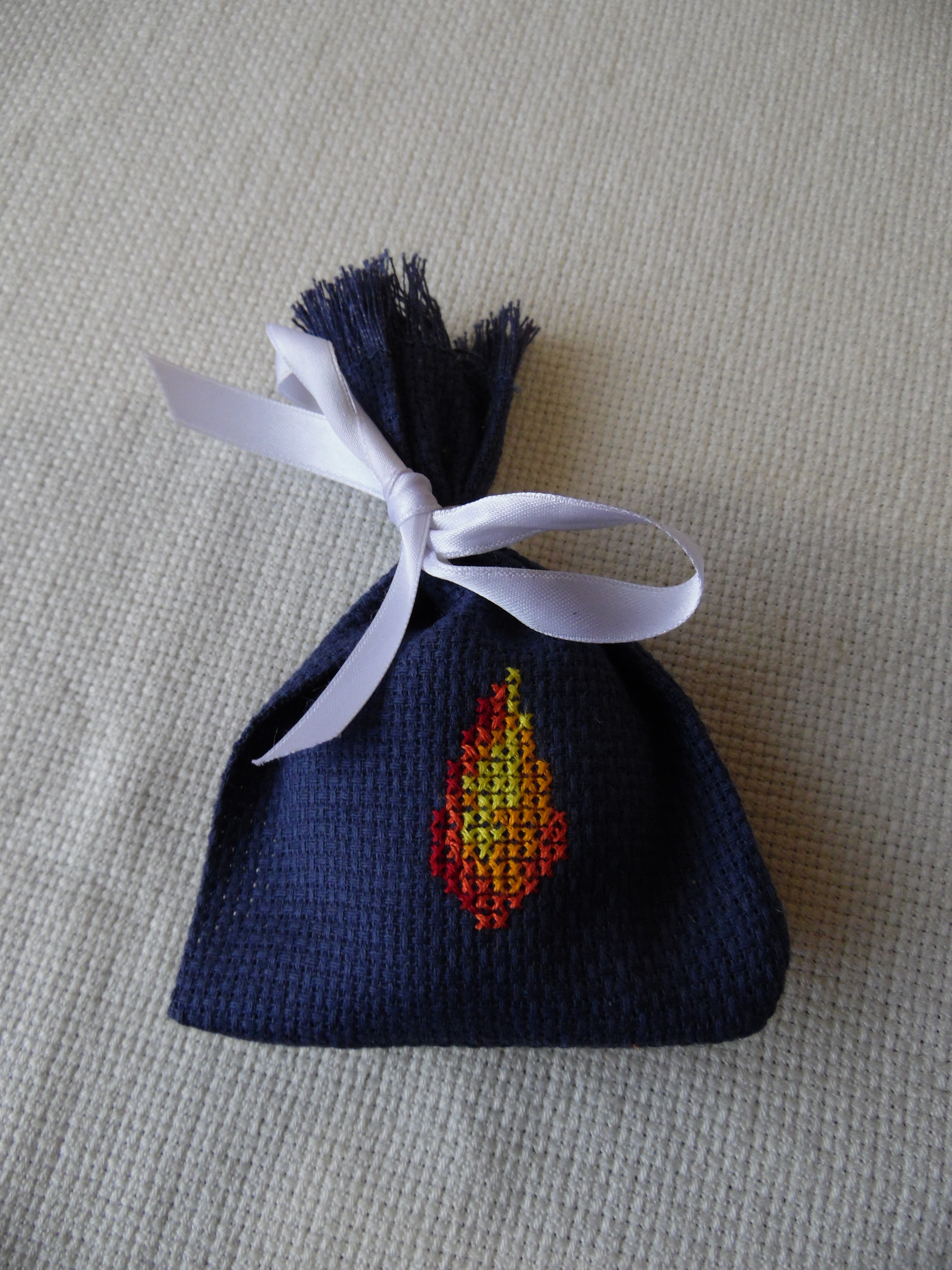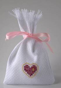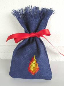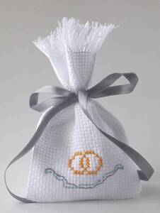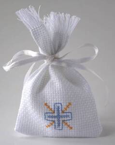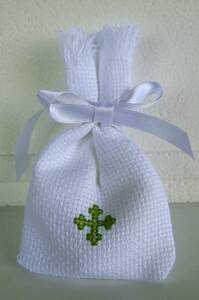 Bomboniera realizzata a mano e composta da un sacchettino di tela aida ricamata a punto croce con diversi soggetti e colori, arricchita con nastro. I ricami possono essere realizzati su richiesta (croce, pane e uva, ostia, il nome di Gesù, spiga di grano, ecc…). Applicazione di decorazioni varie.