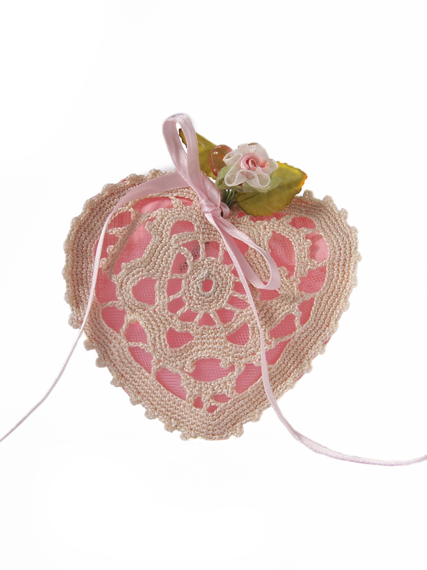 Bomboniera realizzata a mano e composta da un sacchettino a forma di cuore realizzata a uncinetto, arricchita con nastro. Applicazione di decorazioni varie.