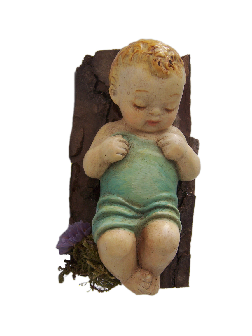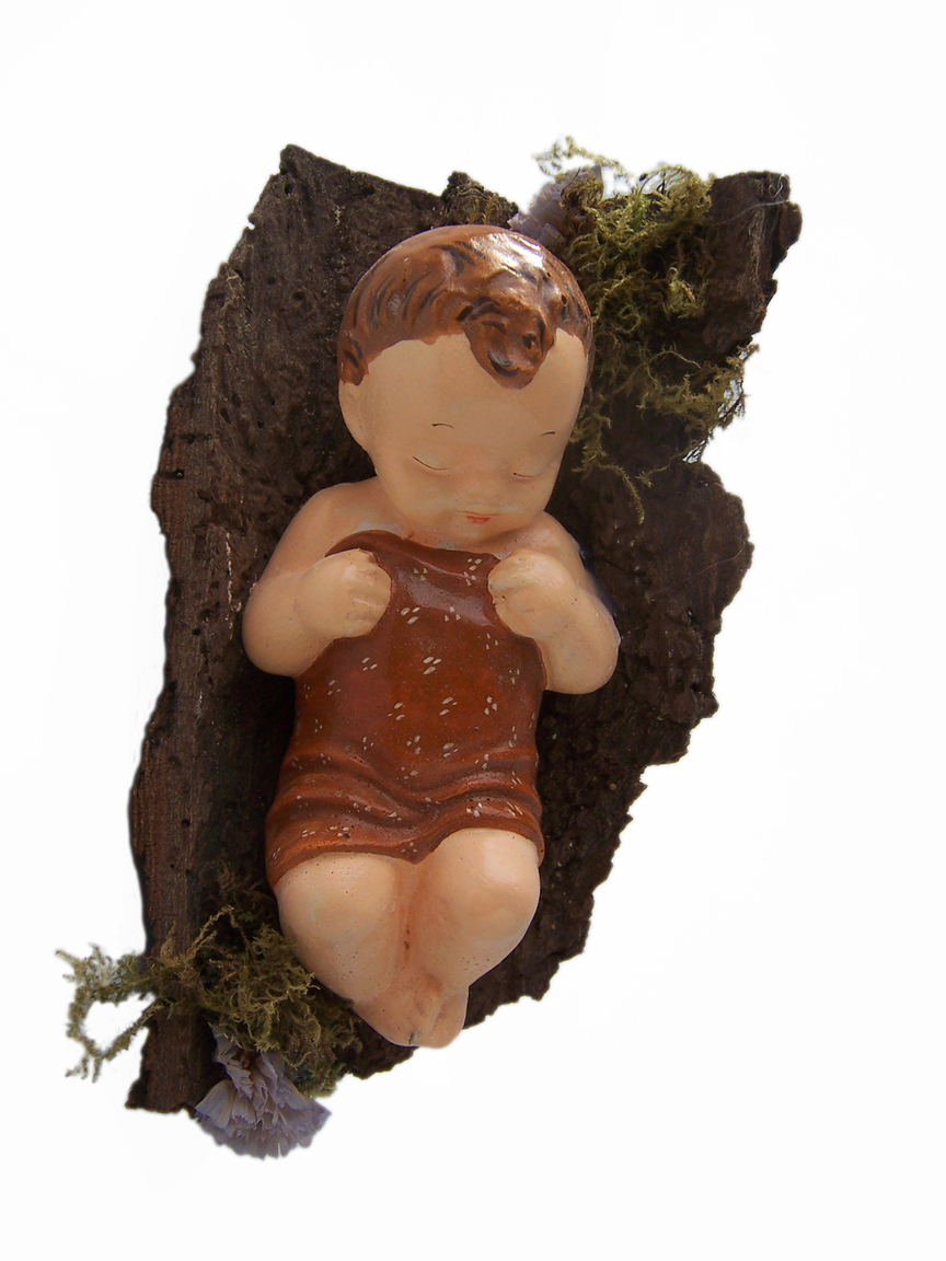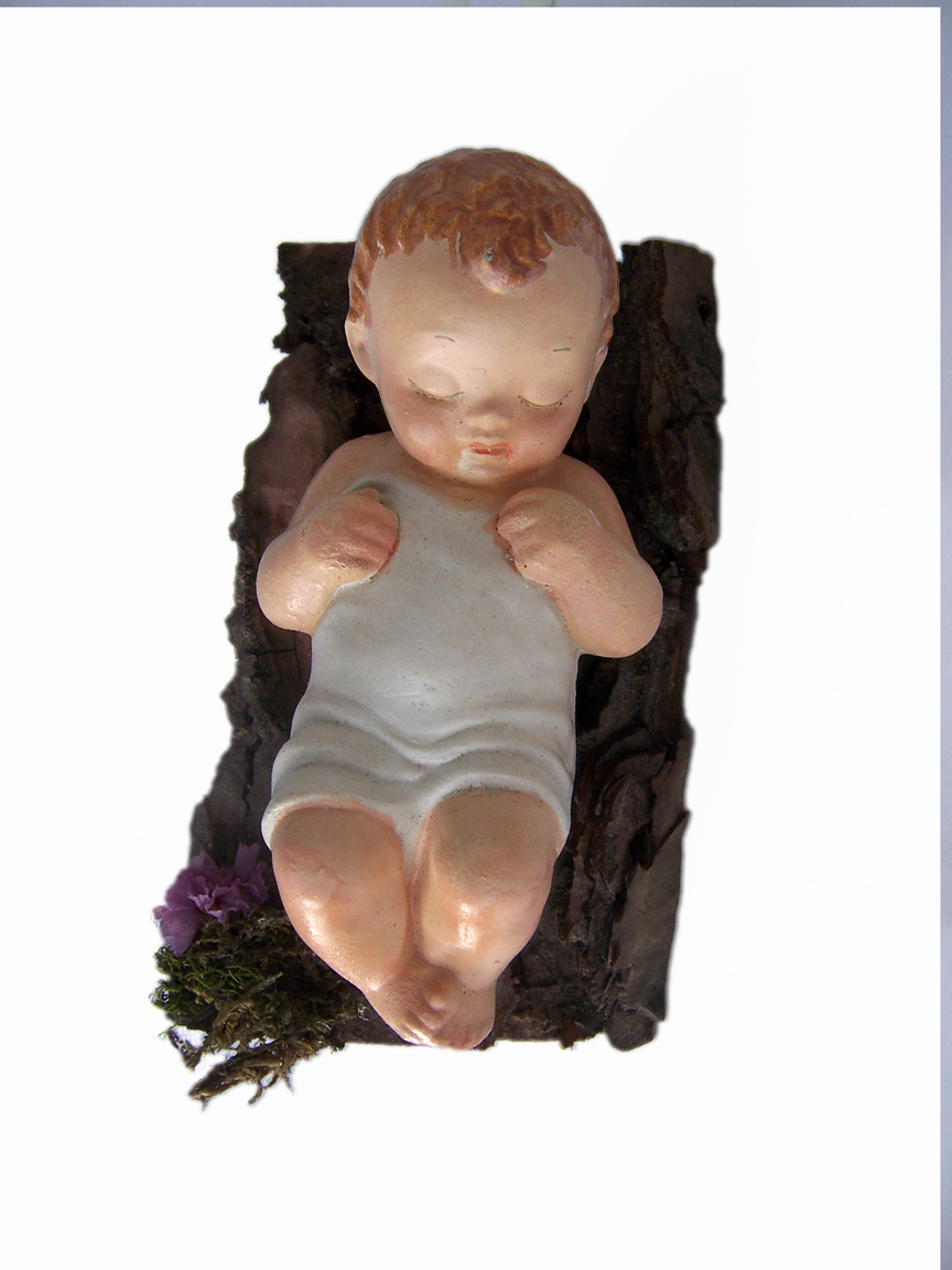 Dolce statuina di Gesù Bambino che dorme coperto da un lenzuolino, realizzata in gesso, dipinta e rifinita a mano, incollata su corteccia di legno, e abbellita con fiori secchi, muschio o paglia, o adagiato nella culla.