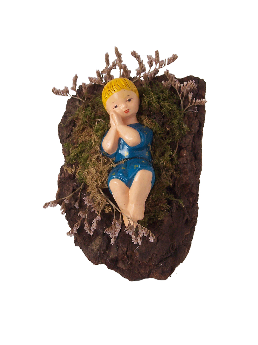 Statuina di Gesù Bambino in atteggiamento di preghiera rivestito di una tunica. Realizzata in gesso, dipinta e rifinita a mano, incollata su corteccia di legno, e abbellita con fiori secchi muschio o paglia.