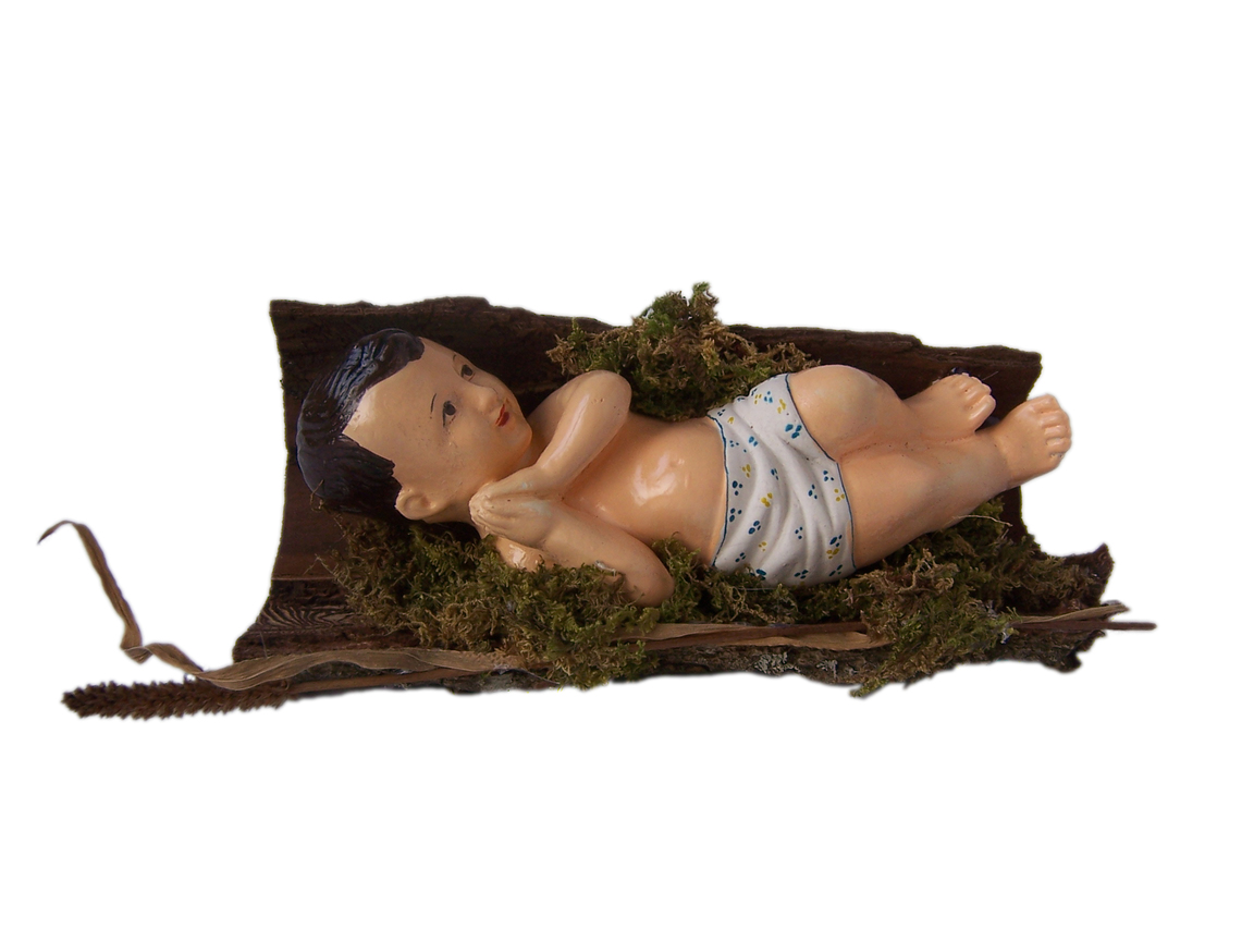 Statuina di Gesù Bambino con la fattura simile a quello venerato nella Basilica di Betlemme in Terra Santa: il Bambino ha gli occhi aperti in atteggiamento di preghiera. Statuina realizzata in gesso, dipinta e rifinita a mano, incollata su corteccia di legno, e abbellita con fiori secchi , muschio o paglia.