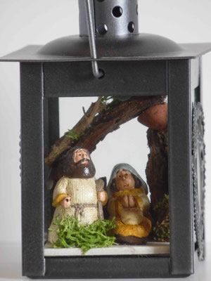 Presepe costituito da una lanterna in metallo, che contiene alcune decorazioni ambientali e i tre elementi in gesso: Gesù bambino nella mangiatoia, Maria e al suo fianco San Giuseppe. È una rappresentazione essenziale della natività, dai sapori della Terra, che ci parla con semplici pennellate del mistero dell’Incarnazione e dell’attesa.
