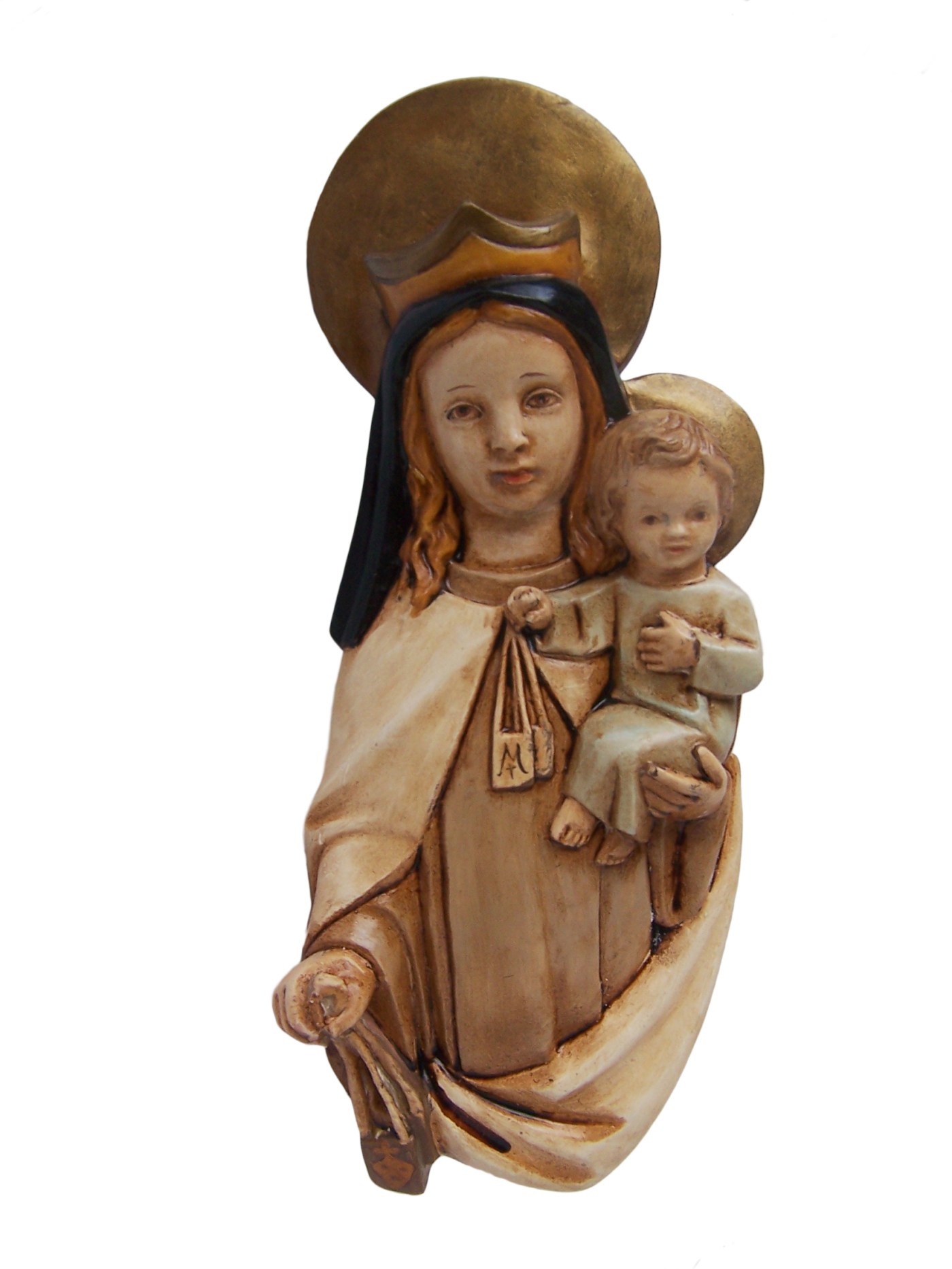 Descrizione: Stampo realizzato in gesso della Beata Vergine Maria venerata con il titolo di Madre del Carmelo. Maria ha in braccio Gesù benedicente e tende lo scapolare come simbolo della sua protezione nei pericoli della vita.