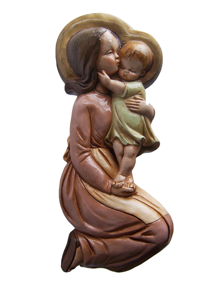 Descrizione: Stampo realizzato in gesso che ritrae la Vergine Maria con tratti giovanili in ginocchio, che stringe a sé Gesù Bambino in piedi che ricambia il suo abbraccio con una tenera carezza.