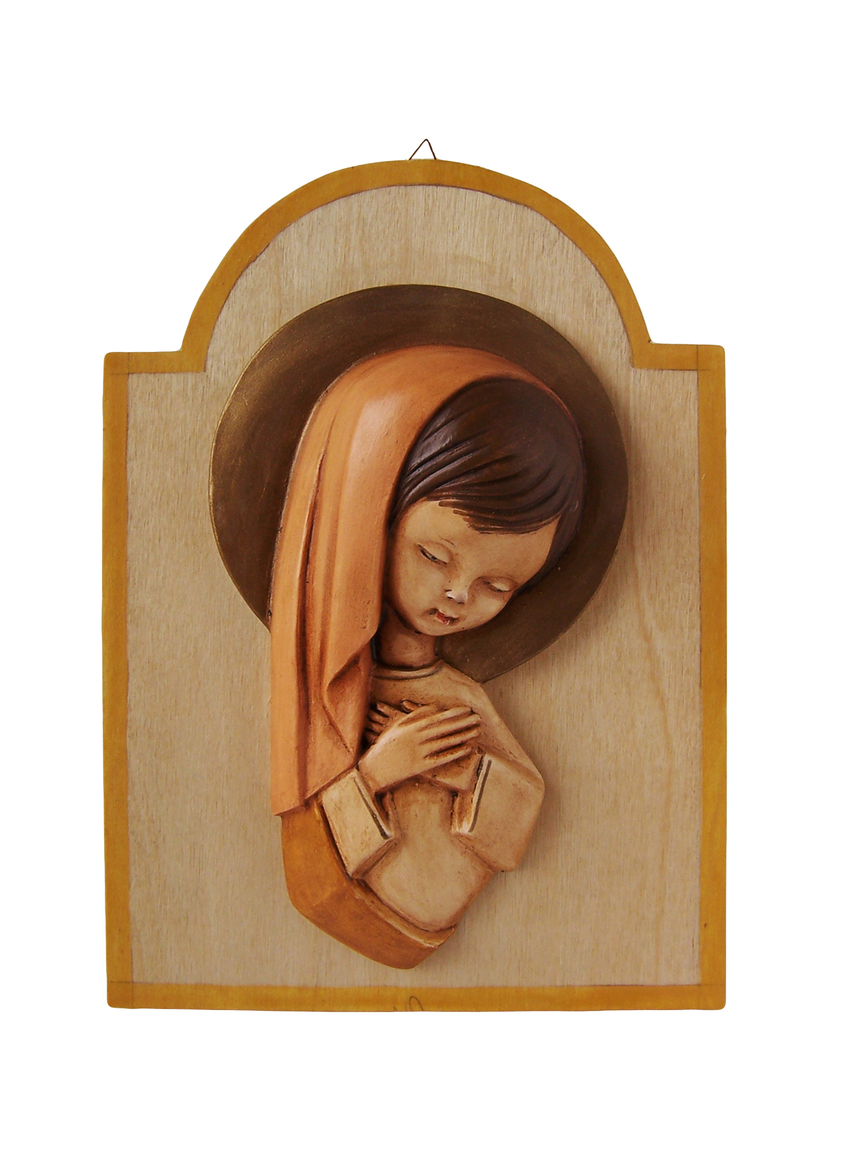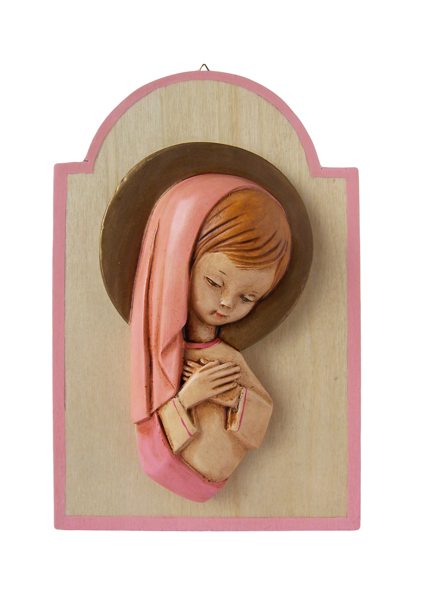Descrizione: Dolce immagine di Maria che appoggia al seno le sue braccia come se custodisse un prezioso tesoro: «Maria serbava nel suo cuore» (Lc 2,51) tutto quello che le accadeva in spirito di ringraziamento e di discernimento. Il grande dono che custodisce e che ci vuole donare è Gesù e in silenzio ci invita ad ascoltarlo. Stampo realizzato in gesso.