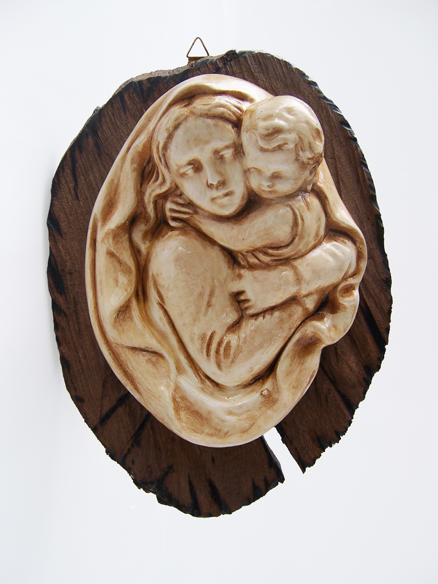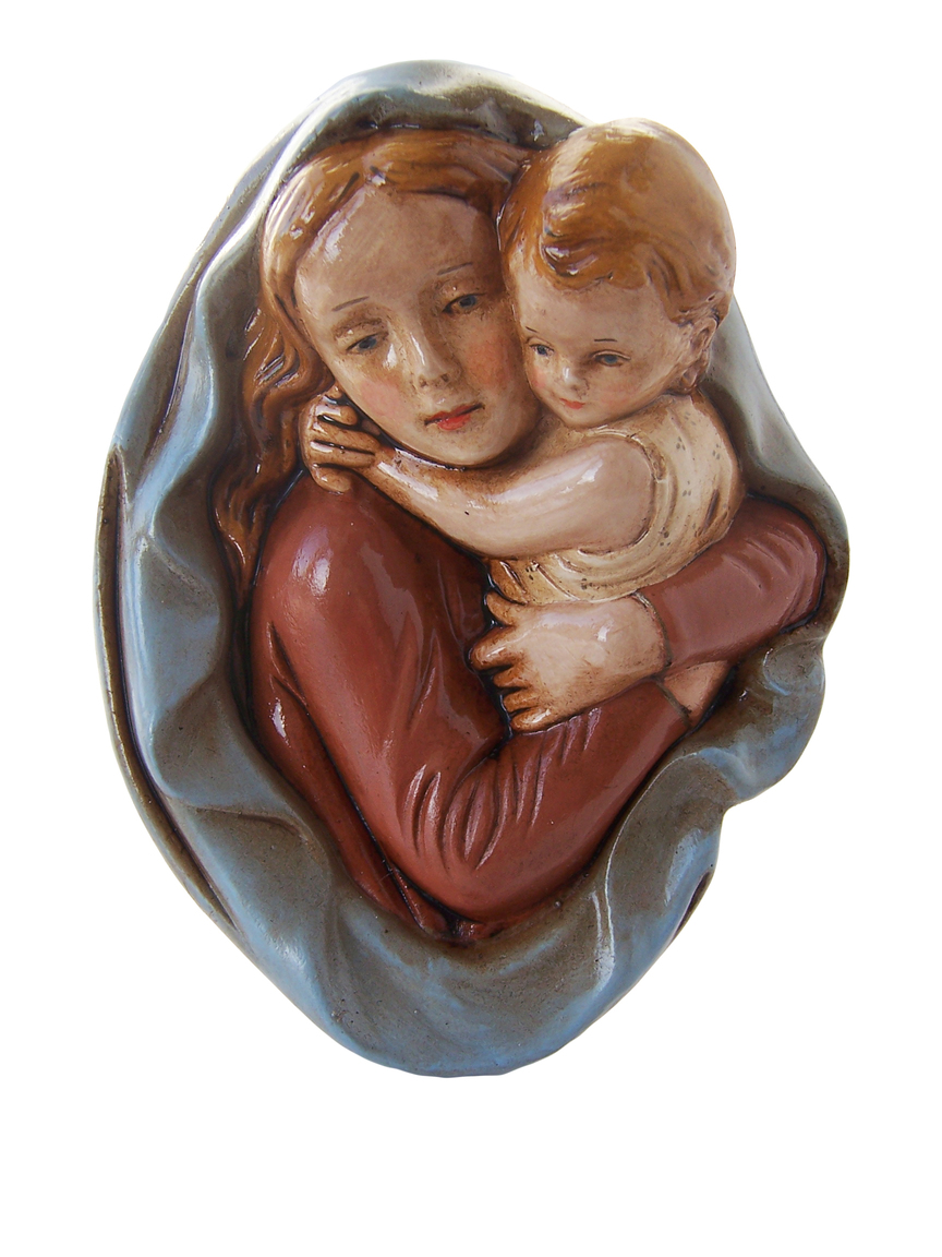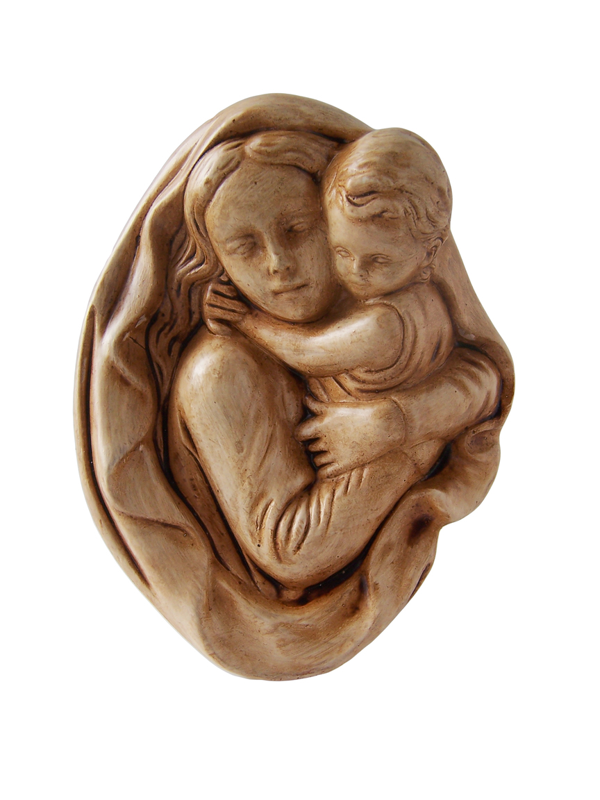 La Vergine Madre stringe a sé Gesù Bambino e lo avvolge con il suo manto. Il “tondo” è simbolo della vita e del divino. Realizzato con stampo in gesso.
