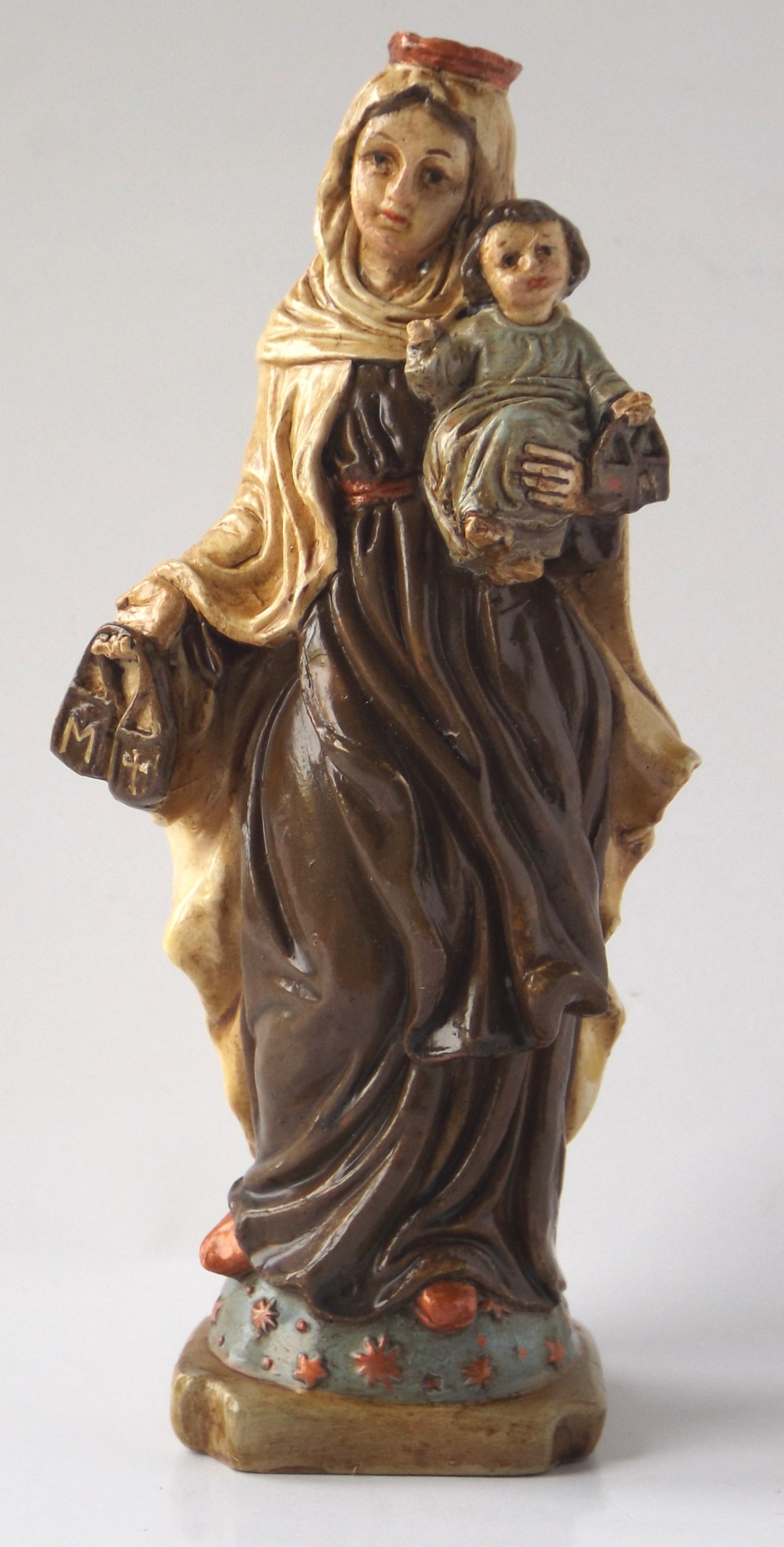 Piccola statua della Vergine del Carmelo, con bambino in braccio e scapolare nella mano. In gesso.