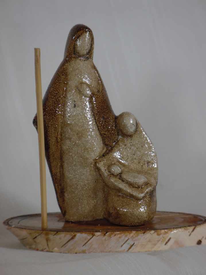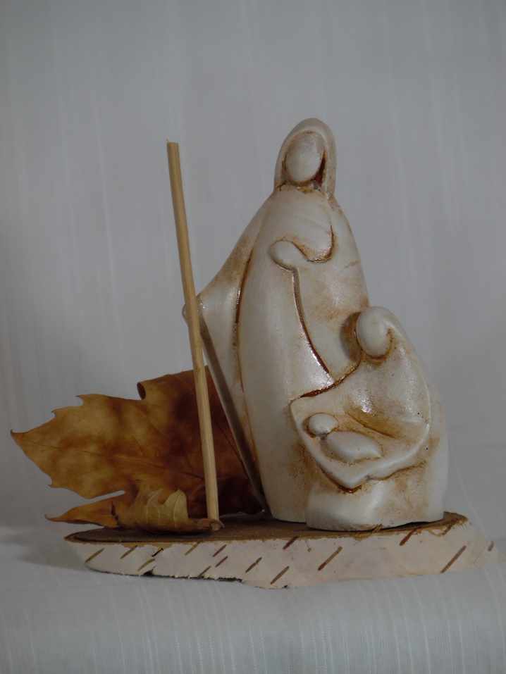 Statuina in gesso raffigurante la Sacra Famiglia: San Giuseppe è al fianco di Maria Santissima che tiene in braccio Gesù Bambino. Si tratta di una rappresentazione stilizzata.