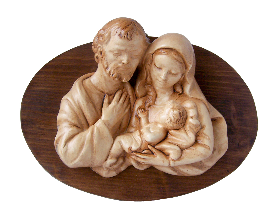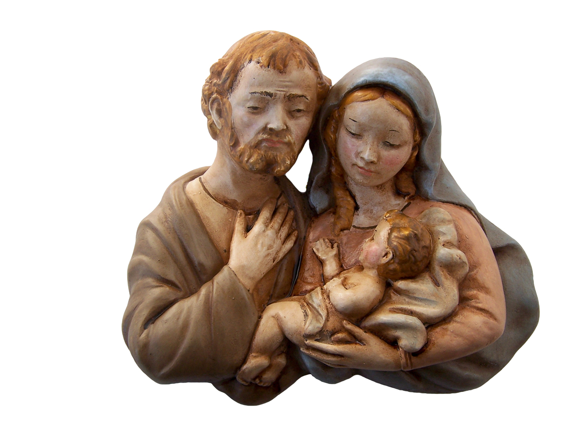 Maria e Giuseppe adorano il piccolo Gesù. Articolo realizzato a mano, con stampo di gesso.