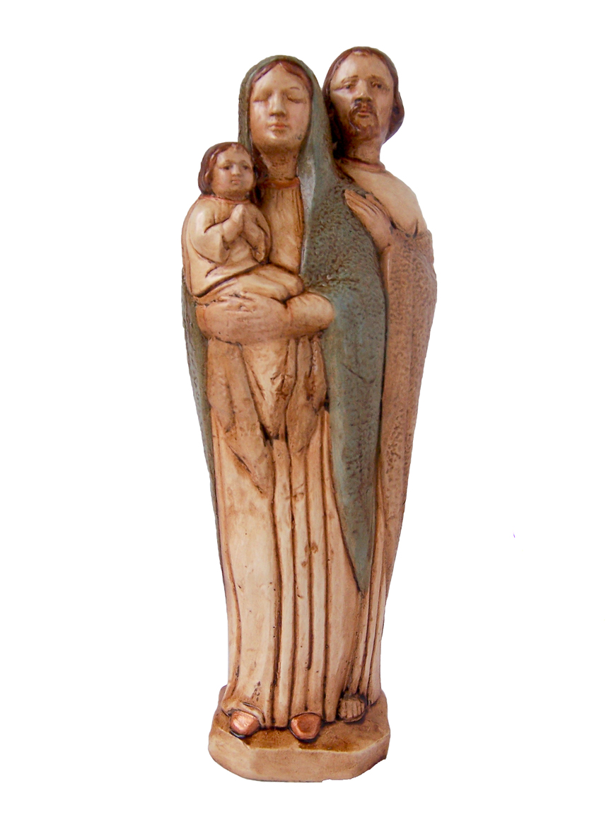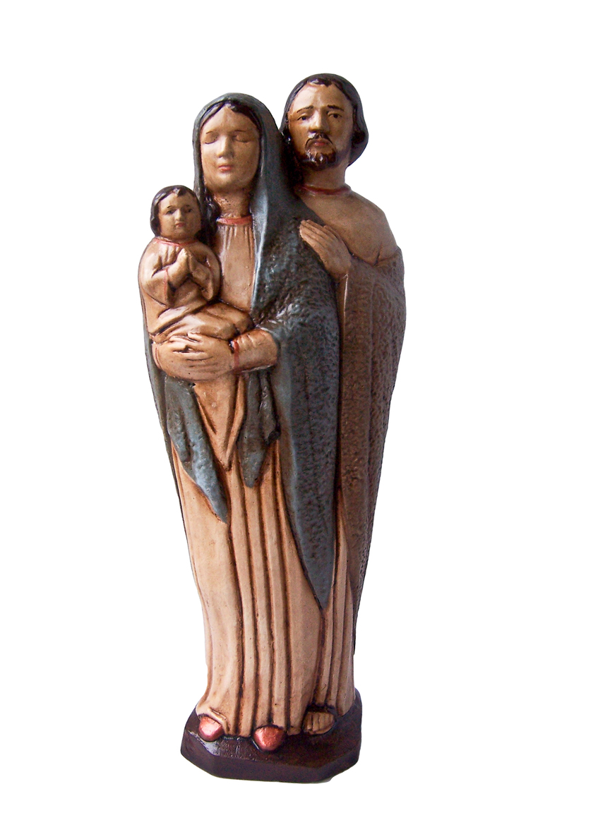 Giuseppe cinge le spalle di Maria che ha in braccio il piccolo Gesù. Articolo realizzato a mano, con stampo di gesso.