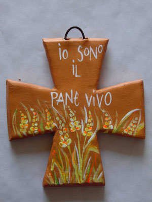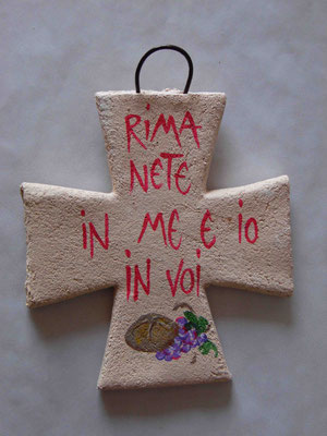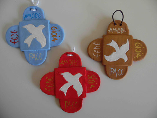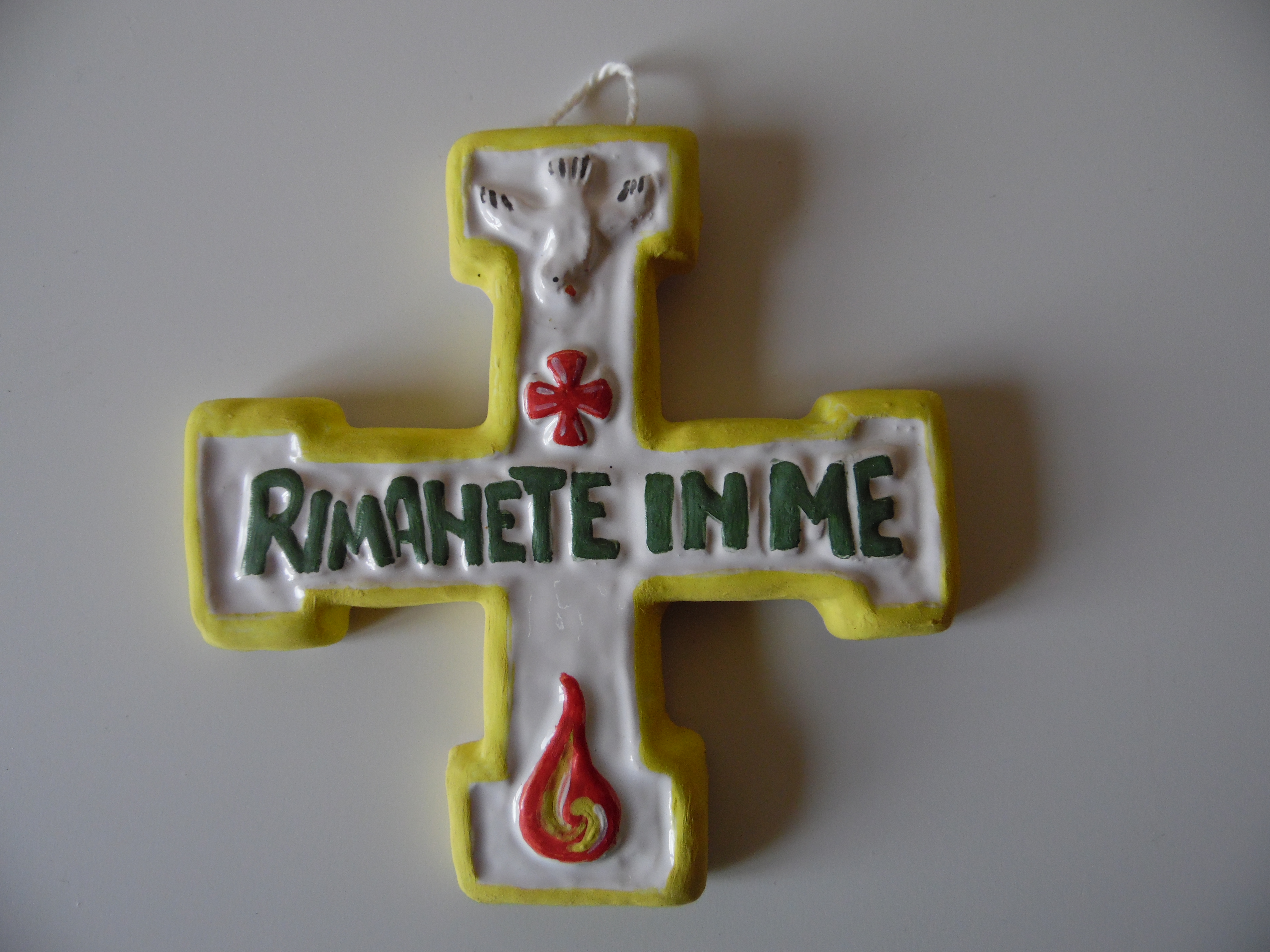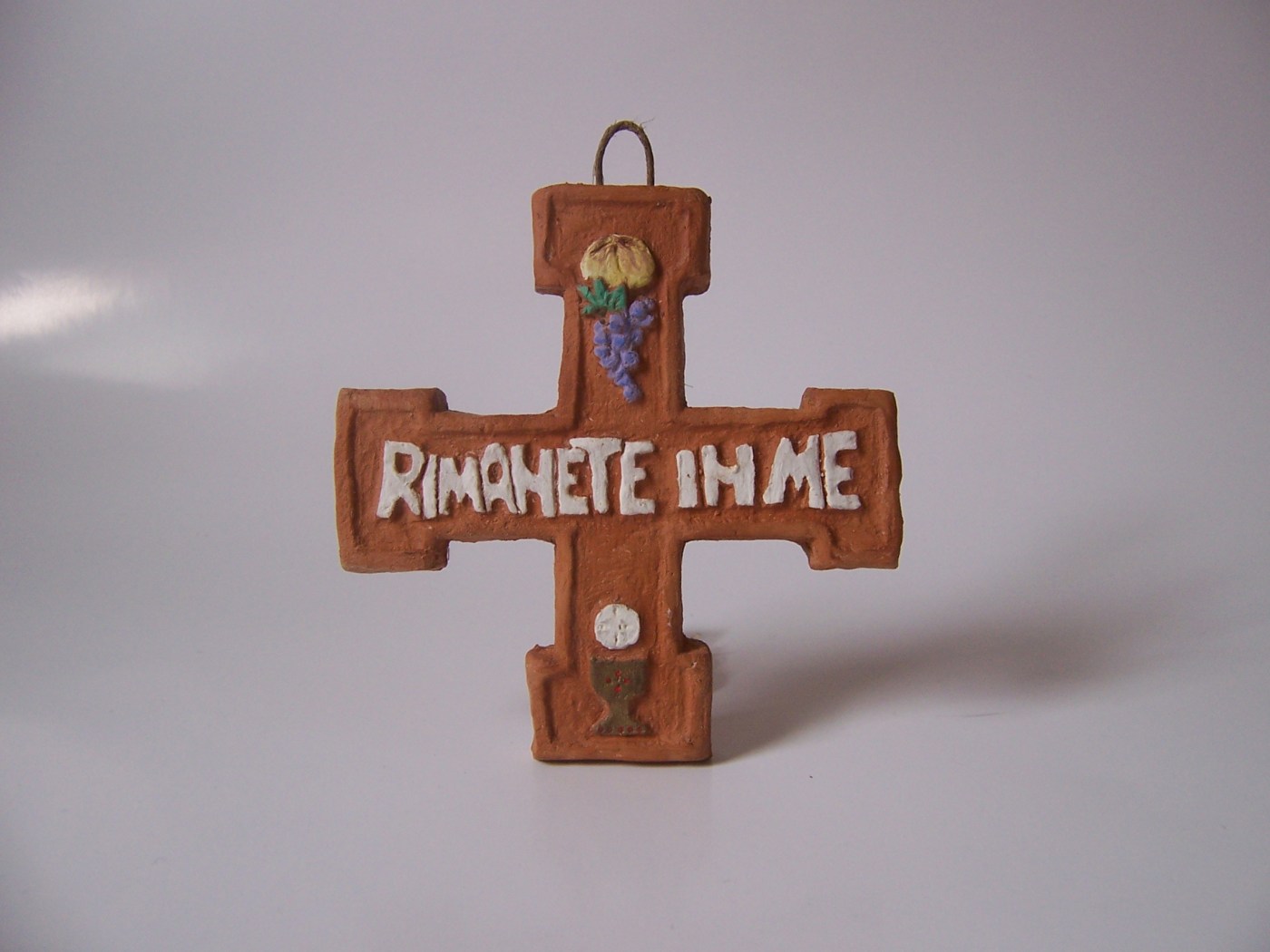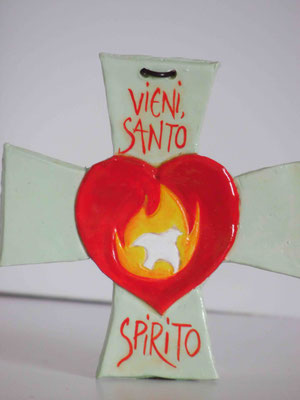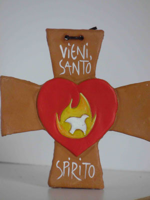 Descrizione: in alto rilievo su una piccola croce in terracotta sono riportati i simboli dello Spirito Santo: la colomba, il fuoco e le frasi «Rimanete in me», pronunciata da Gesù e tratta del Vangelo di Giovanni (Gv 15,4) oppure «Voi siete miei testimoni», o anche: «Abbà Padre!» (Rm 8,15)