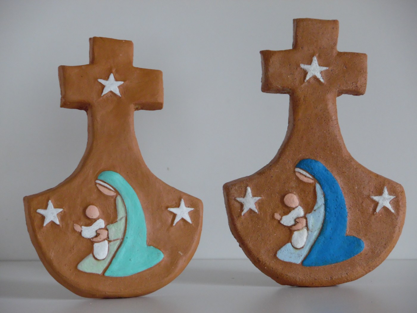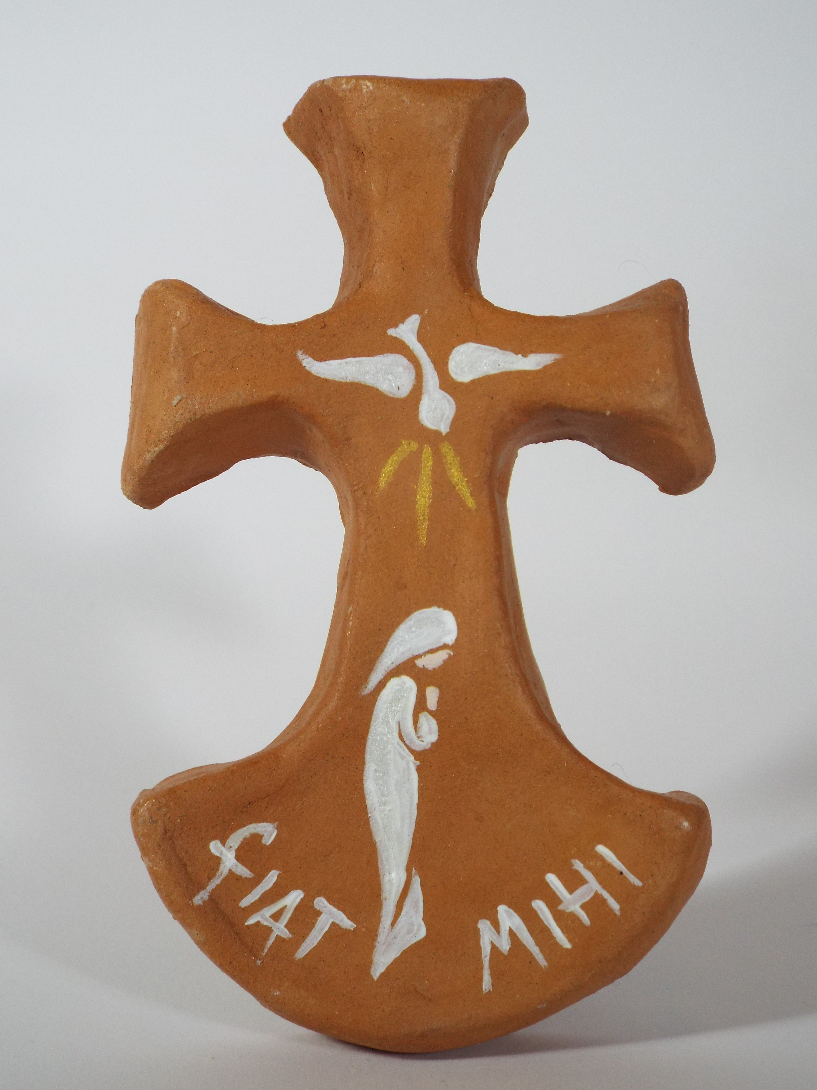 Croce/Monte Carmelo in terracotta, con base di appoggio, da tavolo. Al centro la Madonna offerente il Bambino (“Madre di Dio”) o la Vergine orante con la scritta: «Fiat mihi», cioè «Si compia in me» la tua Parola, la risposta di Maria all’angelo Gabriele, nell’episodio dell’Annunciazione (Lc 1, 38).