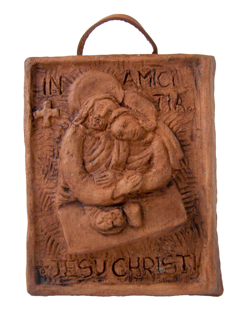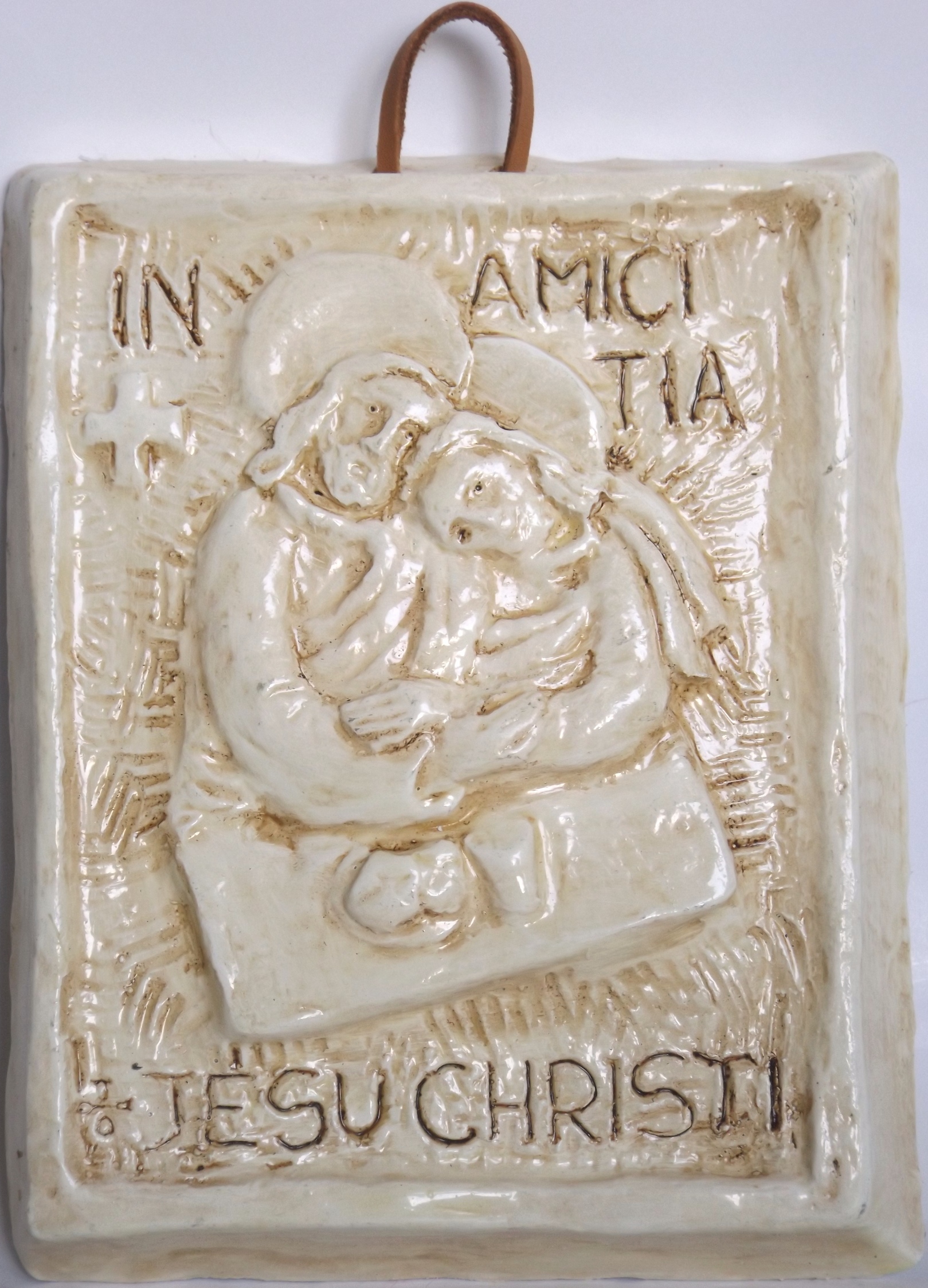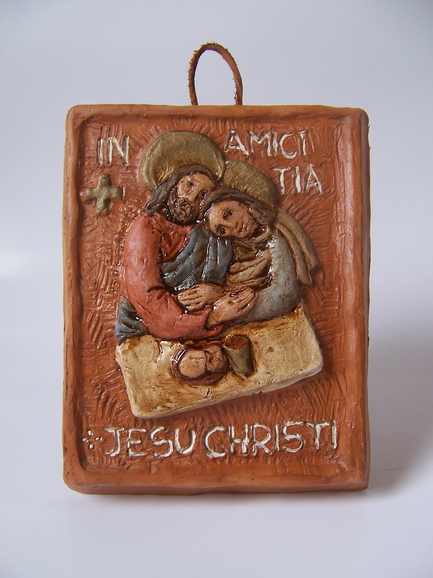 Il Signore Gesù accoglie ed abbraccia il discepolo prediletto (Giovanni), simbolo di ogni amico del Signore, durante l’ultima cena. Articolo realizzato a mano, in terracotta, con stampo di gesso; da appendere, mediante l’apposito nastrino in pelle.