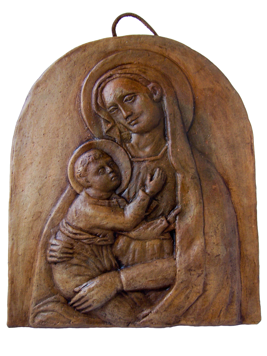 La vergine Maria, stringe a sé Gesù Bambino che si aggrappa al manto di Maria in segno di protezione. Articolo realizzato a mano, in terracotta, con stampo di gesso, da appendere all’interno e all’esterno, mediante apposito nastro in pelle.