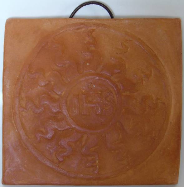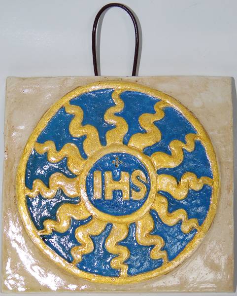 Iniziali del nome di Gesù in latino: Jesu Hominis Salvator, attorniate dai raggi del sole secondo il simbolo eucaristico ideato da San Bernardino da Siena. Articolo realizzato a mano, in terracotta, con stampo di gesso; da appendere a interni o esterni, mediante apposito nastrino in pelle.