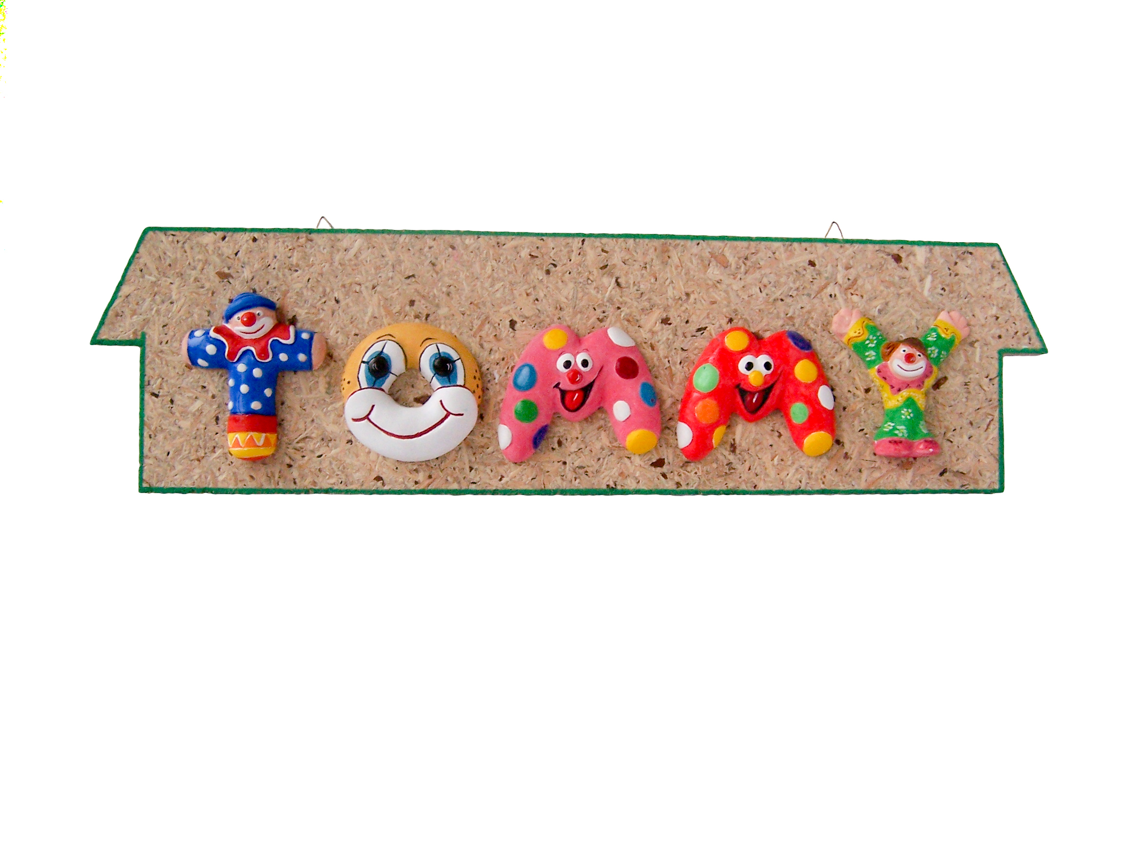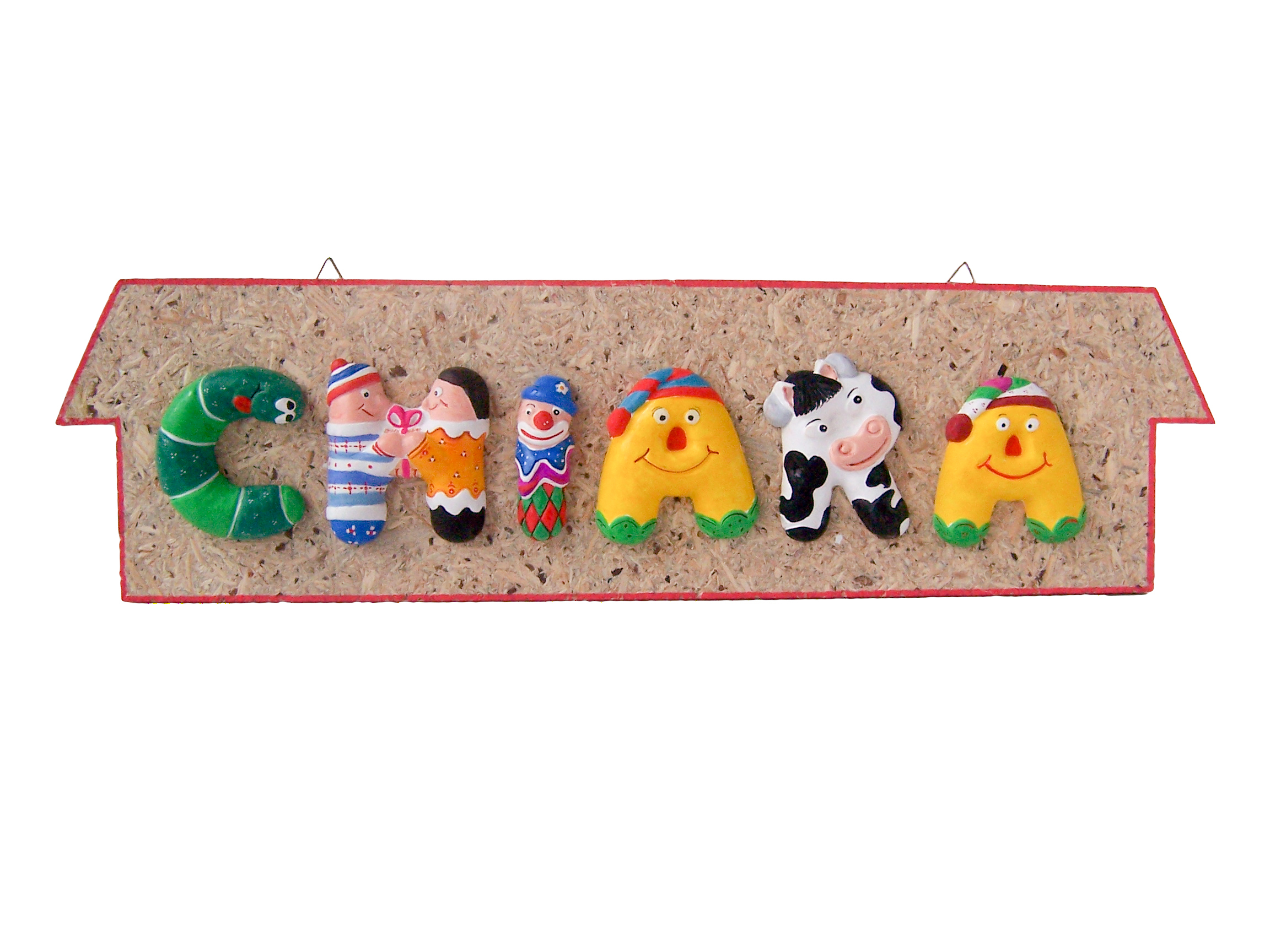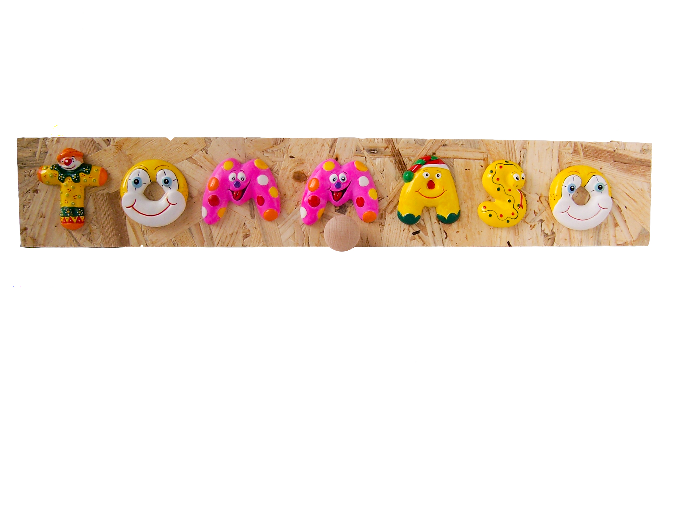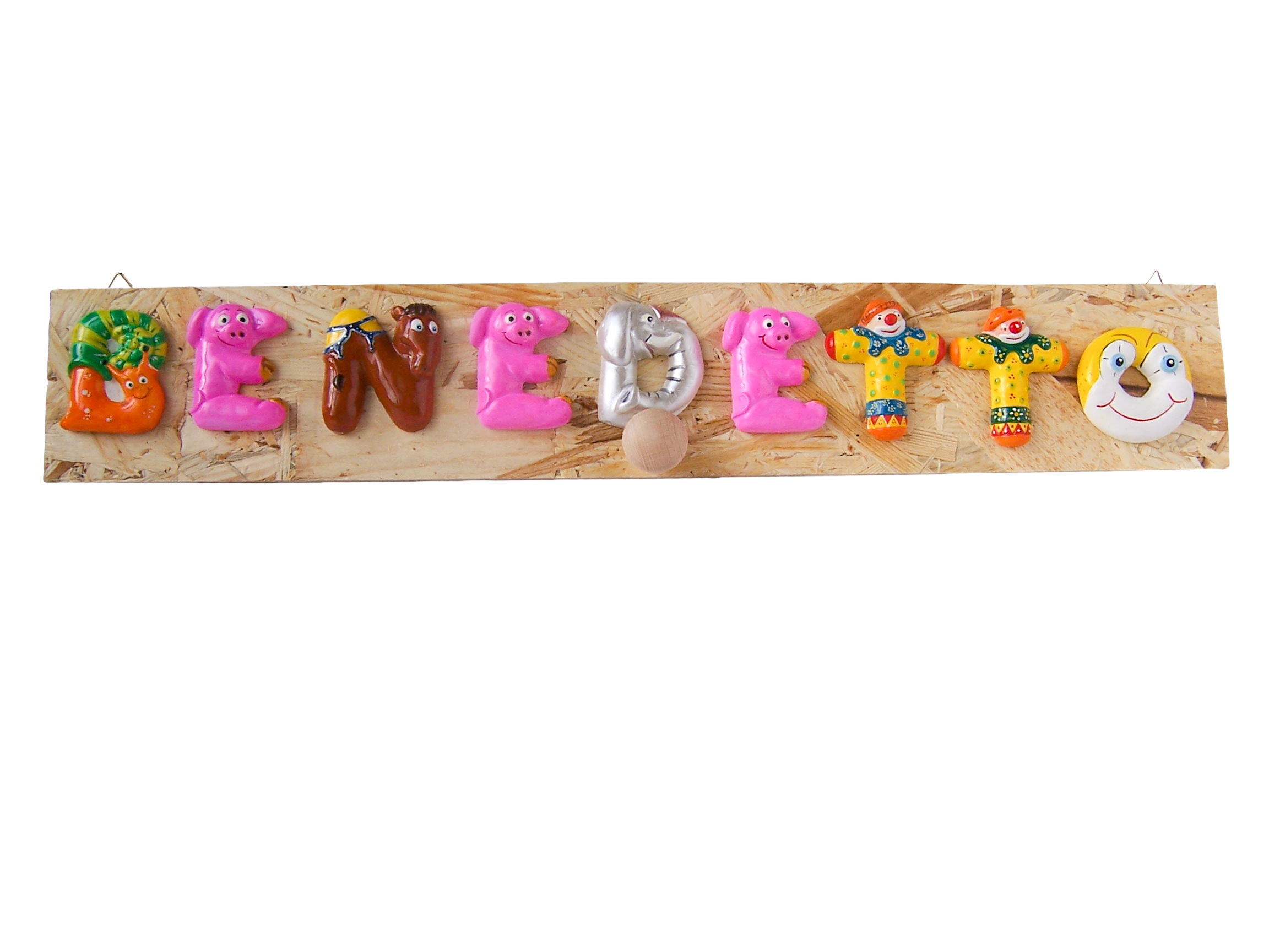 Con letterine raffiguranti animali e pagliaccetti si compongono i nomi propri dei bambini, su richiesta. Oltre la scritta si può aggiungere un appendi abito o due per renderla un attaccapanni. Le modifiche si effettuano su richiesta. Articolo realizzato a mano, con stampo di gesso.