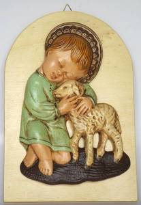 Statuina realizzata con stampo in gesso raffigurante Gesù Bambino in atteggiamento di stringere a sé una pecorella: Gesù Bambino è qui il buon Pastore che si prende cura di ciascun bambino. Stampo realizzato in gesso, lavorato, dipinto e rifinito a mano.
